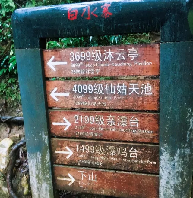 景點(diǎn)指示牌。說實(shí)在走到這里挺累的,但是森榮的人豈會(huì)在此折戟沉沙,吾等將苦困化為舟船,以盼望一覽仙境當(dāng)作劃槳,渡過這漫長又濕滑的臺(tái)階長河!