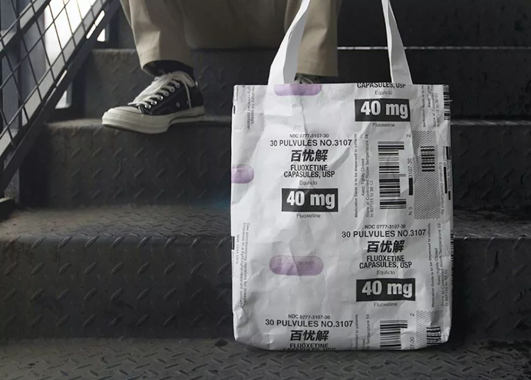 百憂解是一種抗抑郁的藥物,設計師從網絡“喪文化”提取關鍵信息,印刻在藥丸圖案上,表現年輕人對現實生活的一種自嘲態度。